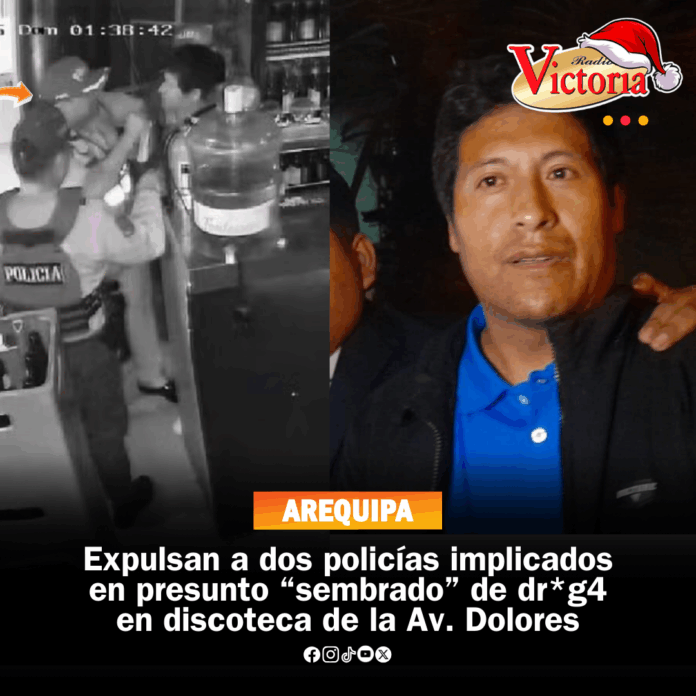 El jefe de la IX Macro Región Policial Arequipa, general PNP Olger Benavides, confirmó la expulsión de dos de los cuatro policías involucrados en el presunto “sembrado” de dr:o:ga y el robo de dinero al cajero y al vigilante del local nocturno Azúcar, ubicado en la avenida Dolores.