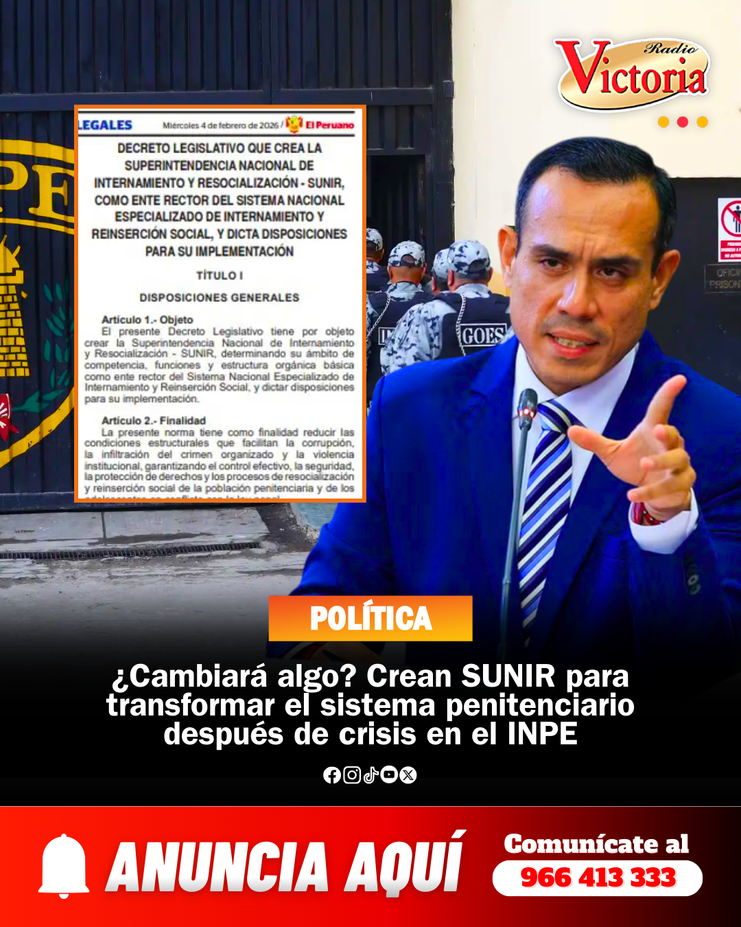 La medida fue anunciada por el ministro de Justicia, Walter Martínez, quien destacó que la fusión de ambas entidades permitirá una reestructuración profunda. Aseguró que la SUNIR no solo brindará un cambio en la gestión administrativa, sino que también descentralizará servicios y se reformará la estructura organizacional del sistema penitenciario, eliminando el Consejo Penitenciario, órgano colegiado que hasta ahora dirigía el INPE. En su lugar, habrá una jefatura única con un perfil técnico especializado.