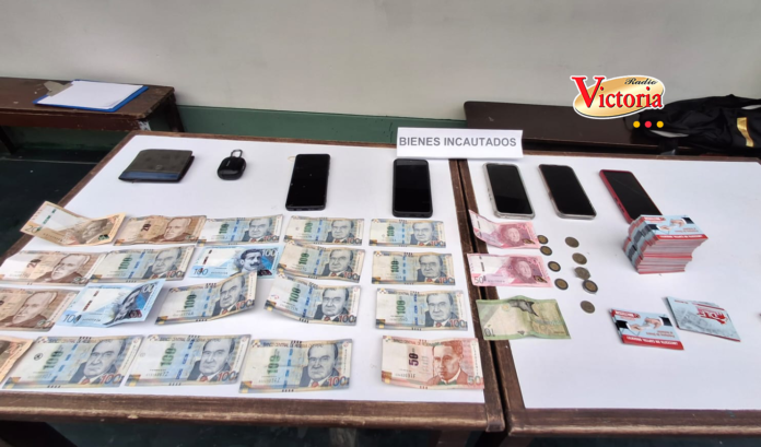 Los agentes policiales lograron la intervención de los dos sujetos quienes llevaban en poder S/. 1,675.00 entre billetes y monedas, cuatro celulares y tarjetas ofreciendo préstamos.
