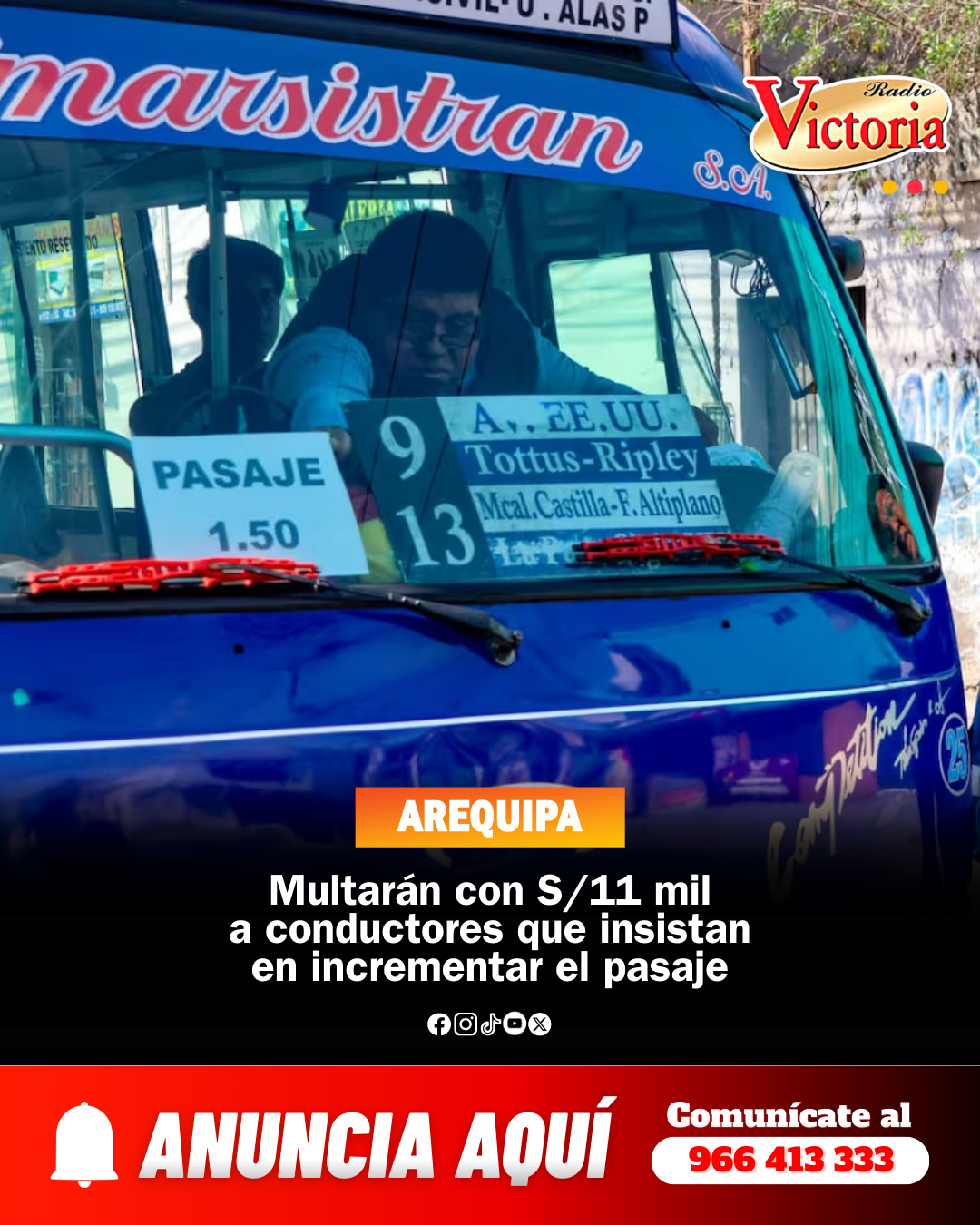 José Suarez, regidor y presidente de la Comisión de Transportes de la Municipalidad Provincial de Arequipa (MPA), informó que los conductores que persistan en aumentar el precio del pasaje sin autorización serían sancionados con multas de hasta 5 UIT, que equivalen a cerca de S/11 mil.