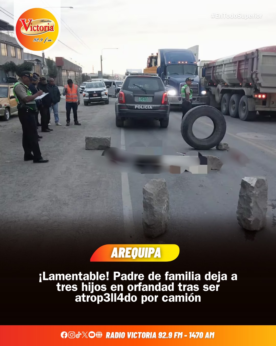 Luis Ccalachua Taco, perdió la vida tras ser arrollado por un camión de carga pesada con placa VCR-713, quien se movilizaba por la Vía de Evitamiento, a la altura del kilómetro 3.9 en Cerro Colorado. Se detalló que la víctima era padre de tres hijos que ahora quedan en situación de orfandad.